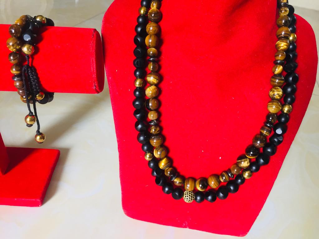 Command attention with our handcrafted Tiger Luxe Bead Set, featuring premium tiger eye stones, matte black beads, and a matching adjustable bracelet. Whether you’re dressing for a traditional event or styling your modern outfit, this set brings confidence and class.